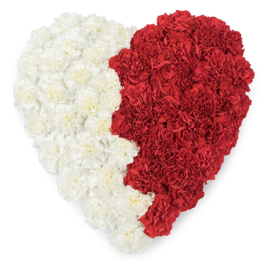 Our Sympathy Carnation Heart Bouquet by Handy Flowers is a beautifully unique arrangement of white and red carnations, thoughtfully designed to convey your heartfelt condolences.