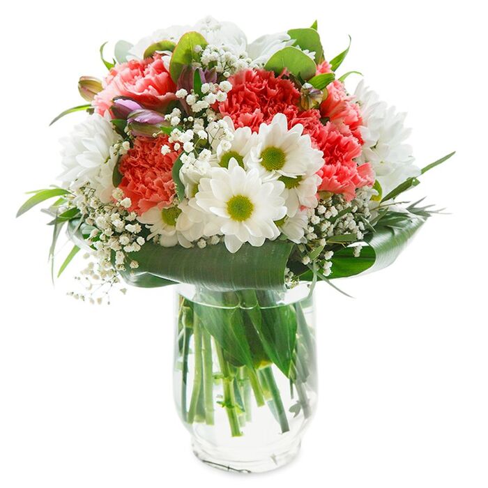 Our stunning bouquet is a luxurious fusion of colors and textures, featuring a sophisticated blend of snow-white chrysanthemums, charming gypsophila, and gentle light pink carnations paired with lush aspidistra leaves. Each flower is hand-selected to ensure exceptional freshness and beauty, making it a gift that radiates care.